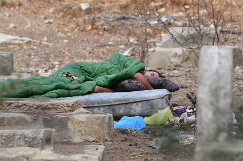A homeless person in Israel sleeps in a cemetery on a mattress. The month of Elul is a time to go out of our way to help the poor and needy.